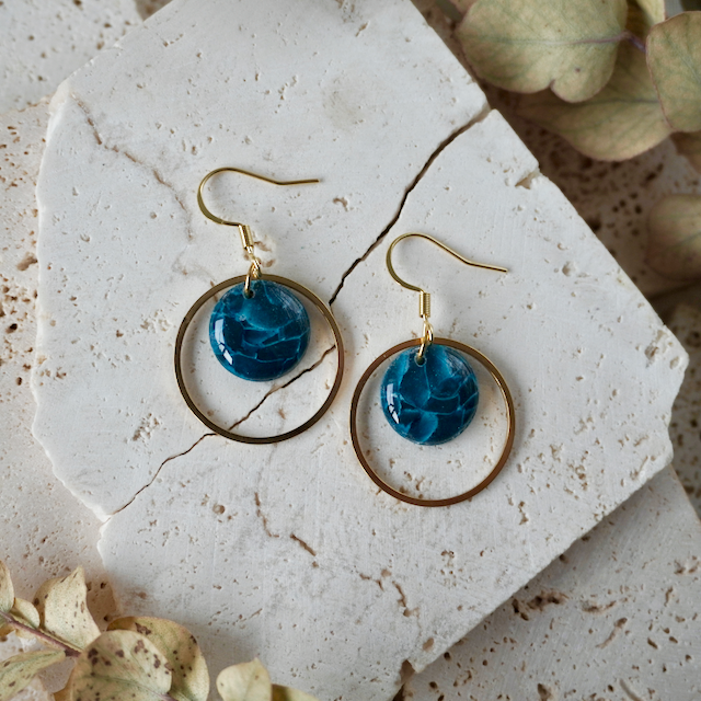 The creative process to craft the unique colour and stone like effect involves a mixture of translucent polymer clay, combined with an array of inks and metal leaf in such a way that achieves a one-of-a-kind finish. To complete the process, it is topped with a transparent resin to really highlight the colour and sparkle!