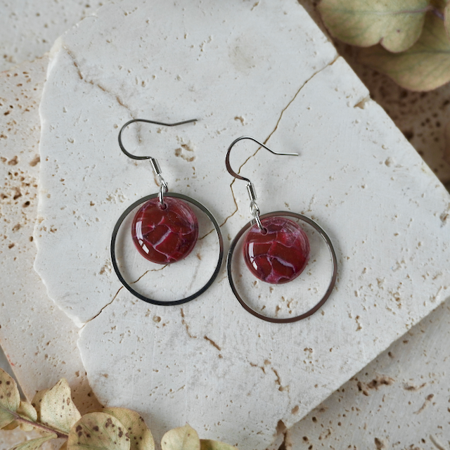 All of our jewellery is crafted by hand, so each has a unique finish making them one-of-a-kind pieces. The colour in the earring glows with vibrancy when the sun hits them.