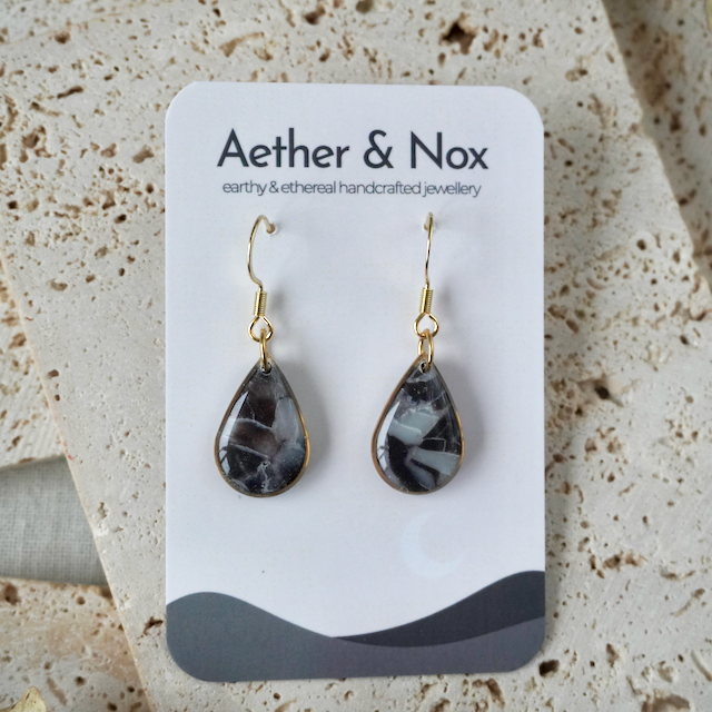 Materials - Polymer clay, clear UV resin and stainless steel fixings with optional rubber backs. These earrings will be provided on an Aether & Nox branded backing card