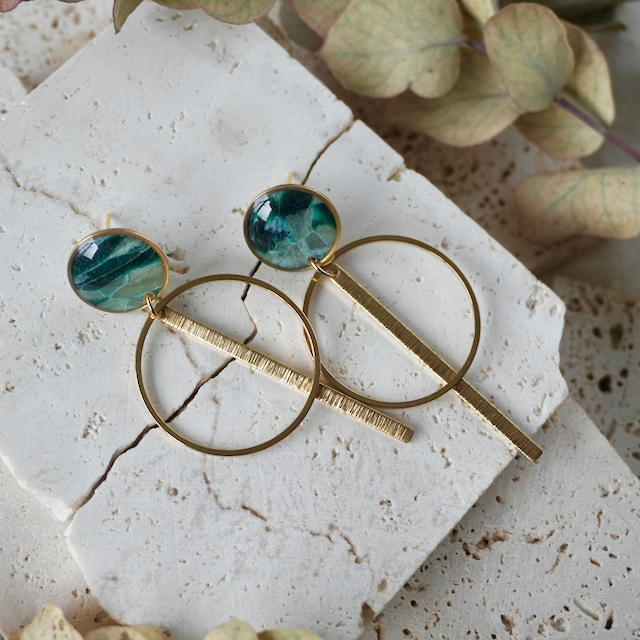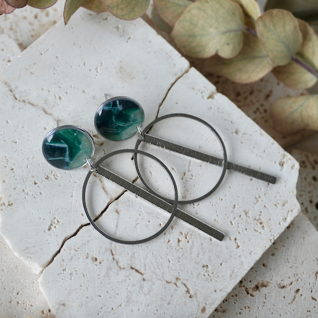 All of our jewellery is crafted by hand, so each has a unique finish making them one-of-a-kind pieces. The colour in the earring glows with vibrancy when the sun hits them.