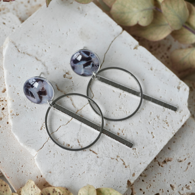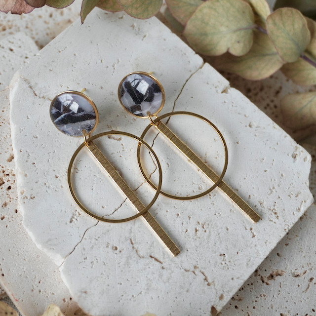 The creative process to craft the unique colour and stone like effect involves a mixture of translucent polymer clay, combined with an array of inks and metal leaf in such a way that achieves a one-of-a-kind finish. To complete the process, it is topped with a transparent resin to really highlight the colour and sparkle!