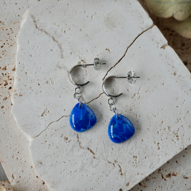 All of our jewellery is crafted by hand, so each has a unique finish making them one-of-a-kind pieces. The colour in the earring glows with vibrancy when the sun hits them.
